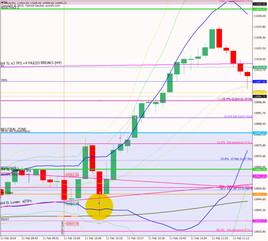 The move that began on 6th Feb has slowed down. There was a big buy-in on Friday from 10868, followed by a strong US session and then a backwards and forwards ON session. 11000 will be critical today with CBOL just above it at 11007, and above that is Friday’s high at 11045. However, despite all these obvious levels and the BNR, we also have the cash chart 50MA at 10982 and acceptance above or below will define the current trend as up or down – or neutral if price just vibrates around it and makes no headway in either direction.