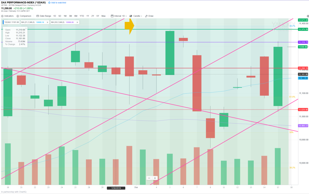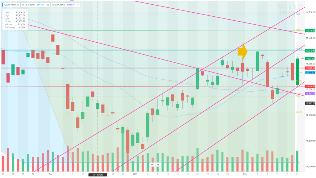 The levels are very clear today and the question is whether Friday’s huge move will move will have legs. The move was also an outside day. Does the market now have enough MOM to exceed the 5th Feb highs? It is interesting that this level is also the bottom of the previous upward channel. If it does get here today, I will definitely expect a pullback before it regains the channel. The 3-month chart shows the two parallel channels quite clearly. On the downside, it has a way to go but a break of the lower upward sloping TL would mean curtains for this rally – the 5-day ATR is now 184 so the market has some energy.