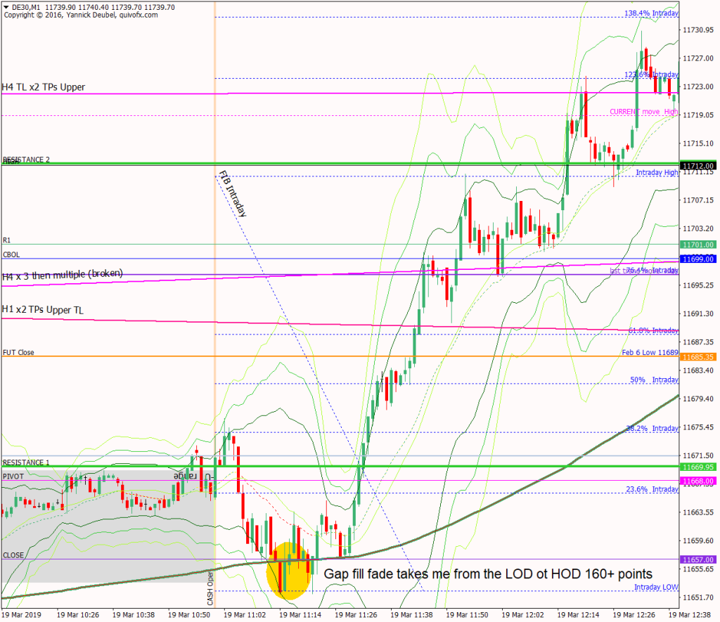 - a low volatility environment is ideal for the gap fill trade and especially at it filled while outside the3Min Bolli – the trade actually achieved 16R as it was the low of the day