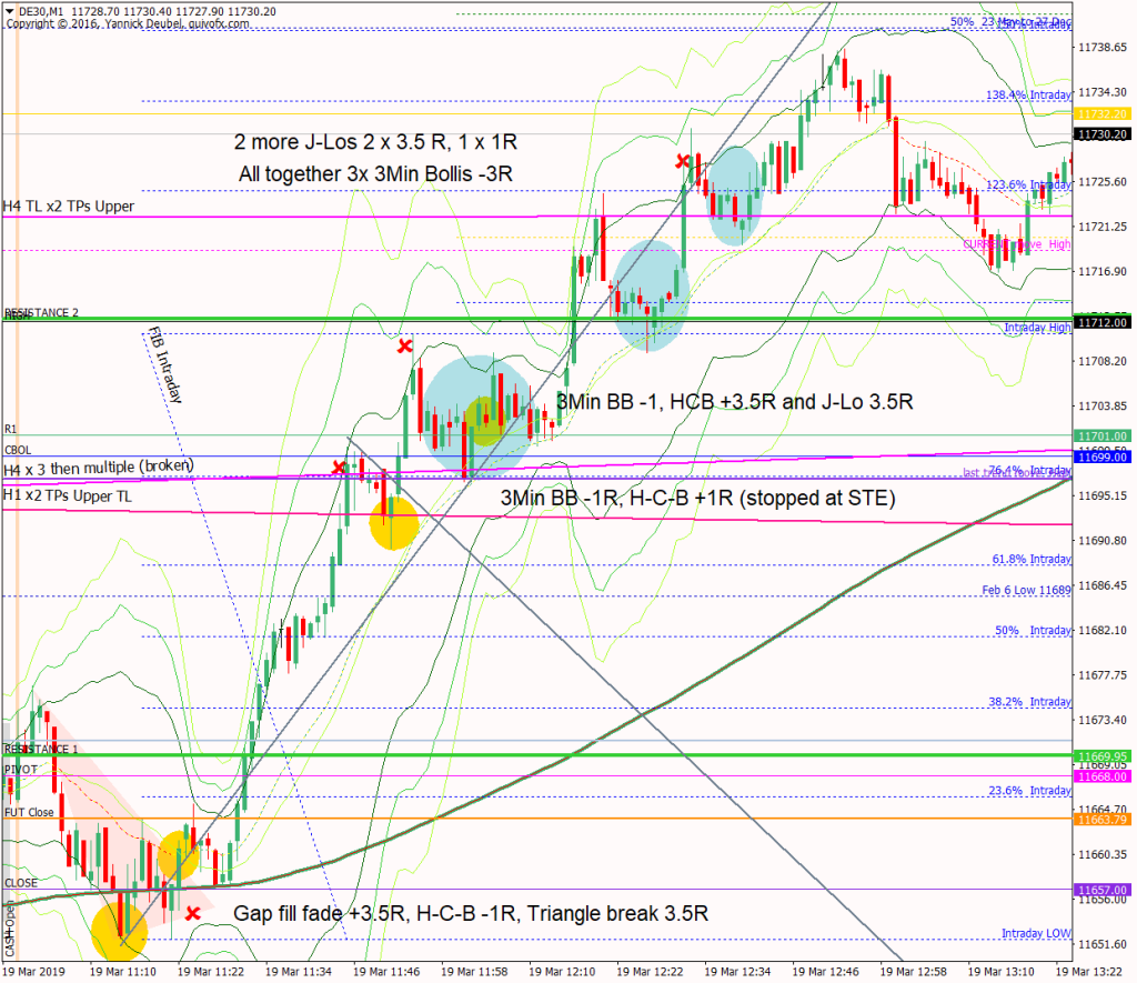 How precise were my levels? RES 1 provided a good selling opportunity at the open for +1R and then the market ripped through it. RES 2 was just missed on the first attempt and exceeded on the second – it didn’t work as a 3Min Bolli but it did give excellent H-C-B and J-Lo setups. RES 3 was a not a good level but saw a minor reaction (why was it there and just above weekly R1 and daily cash chart 200 MA??)