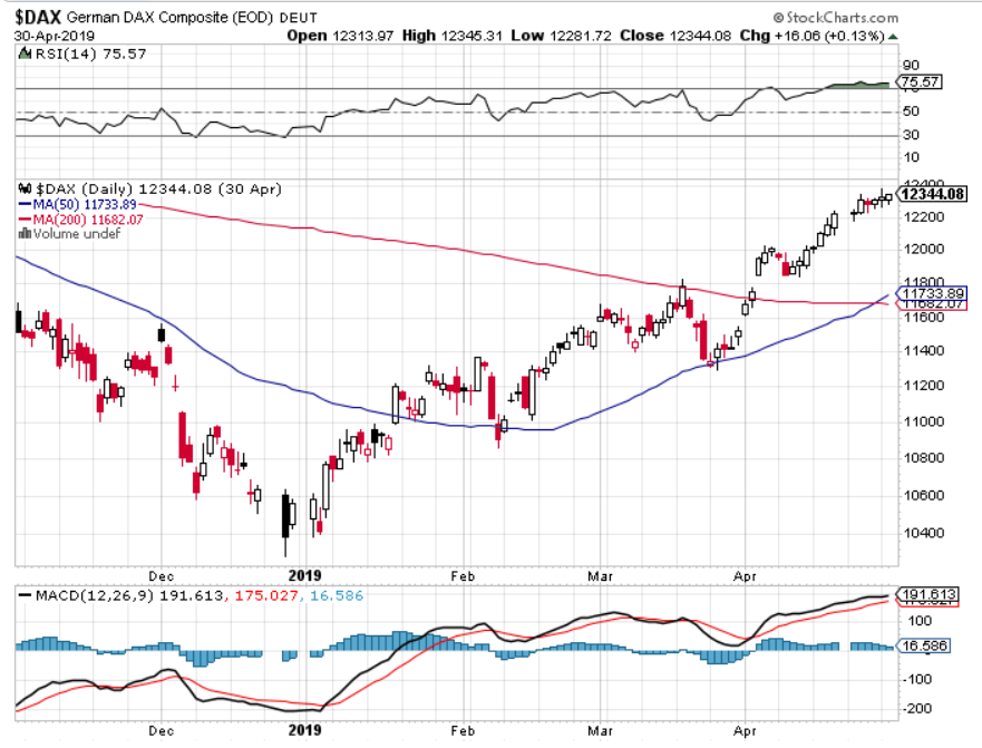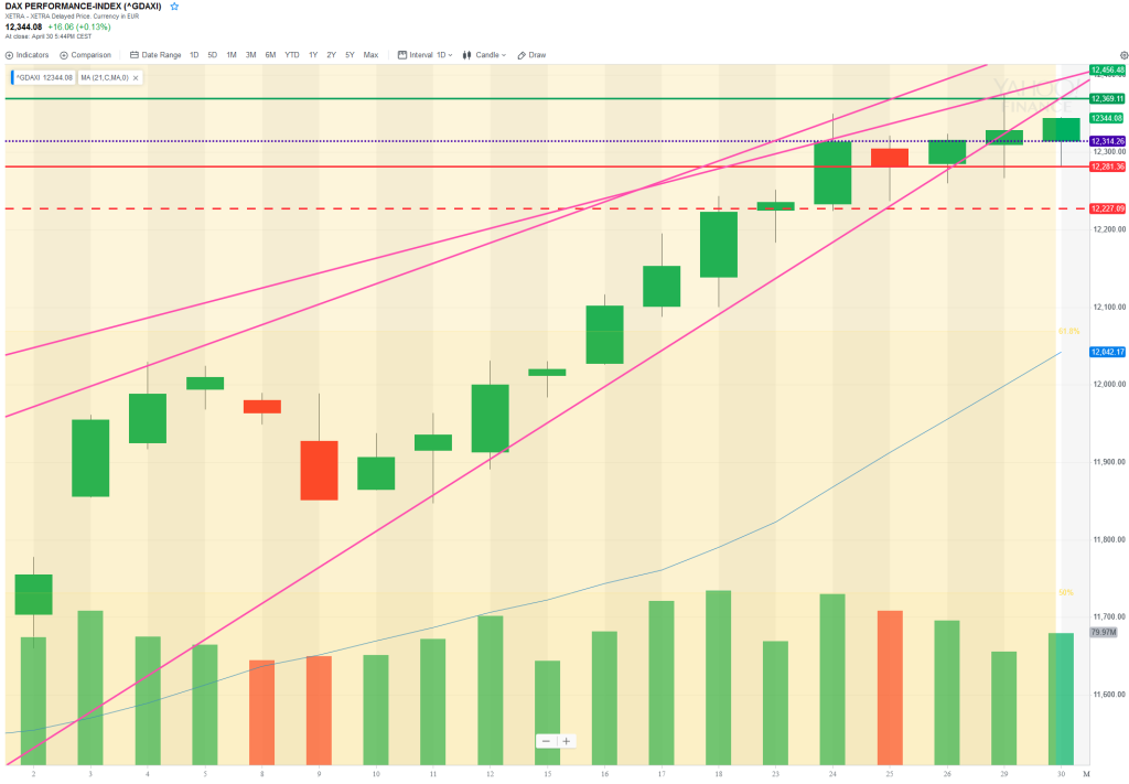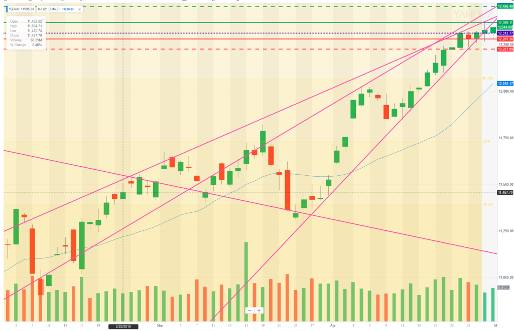 ON, the market opened 123 points lower than Tuesday’s close (the market was closed yesterday for May 1), and this move has broken through important supporting KLs. The market fell through the TL that supported the rising wedge on Monday but did very little with the move and saw a lot of buying into the close on Tuesday. ON, the market regained around 50pts and the futures session has been robust so far, and looks to open to with a gap up. The question is, is this positive move jsu backing and filling from Tuesday’s US session action and the subsequent gap down, or does it mean it’s set for new highs today – especially as it’s the first trading day of the month? The TL that supported the rising wedge will be critical today, as the marekt is well on its way to retesting it – but will it get throgh the many layers of resistance above? Will first of the month buying be sufficient for a break above 12400?