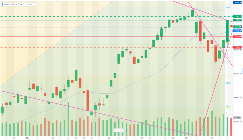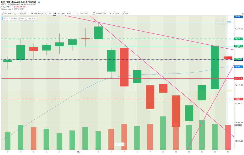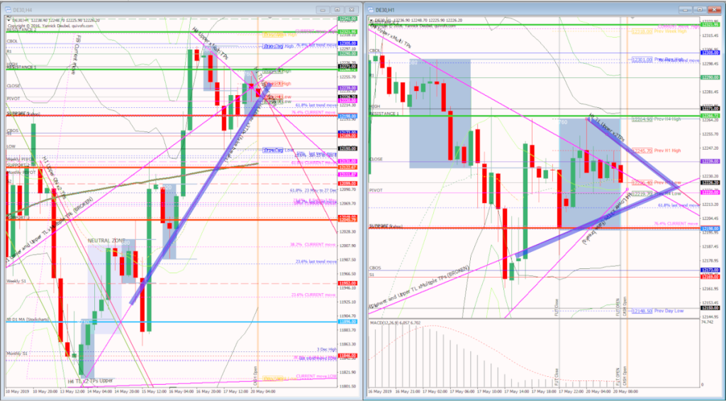 Friday was an inside day and there is a triangle forming on the H1 chart so today is definitely a case for looking for breakouts. A move to the upside is with-trend and there are unfilled gaps above: the closing gap from 3rd May at 12412 and ex-gap at 12344, so those are obvious targets. On the downside, the market is currently sitting on the supporting Tl that has defined this move and been in place since 13th May. If this breaks down, we could see a move to 12045-78 which would be a 50% retrace of last week’s move and a confluence of fibs.