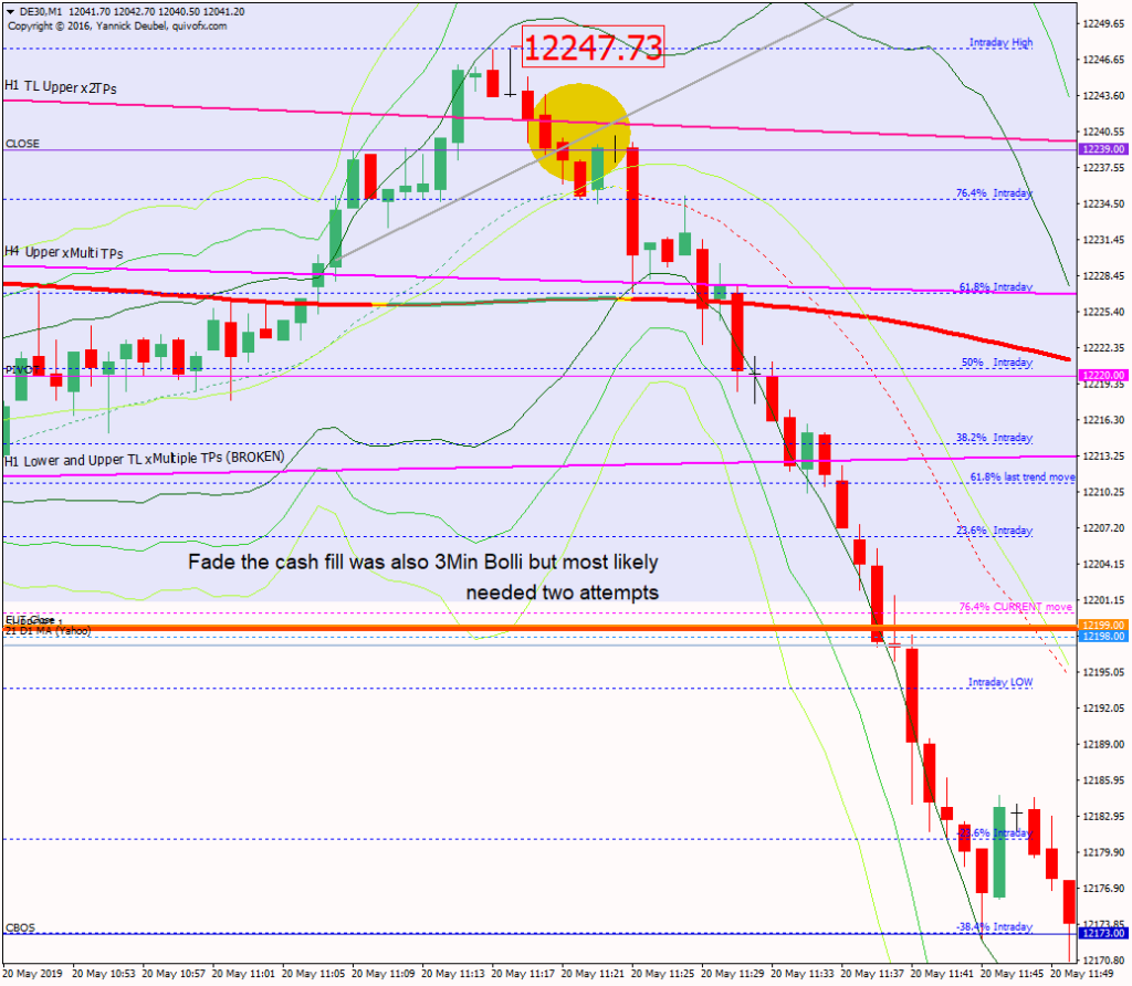 This was undoubtedly the gap fill fade. With an entry on the level and a 10pt SL I was stopped on the first attempt, but because the rejection of the level was clear, and the TL above gave it a good reason to overshoot, it was asking for a second entry. Also, the trade setup as a 3Min Bolli, adding to the probability of it working. The move from gap fill to the cash session low was 250pts, making this a 25R entry.
