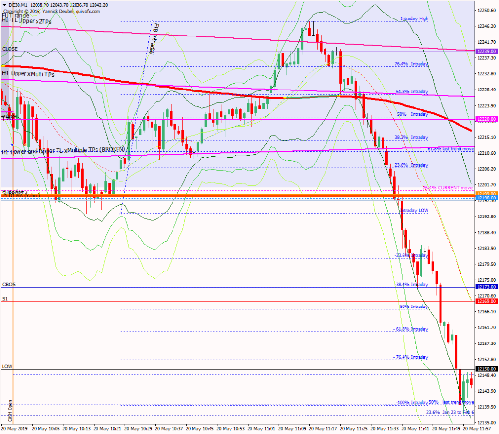 Scenario 2: breaks supporting TL early on and trends down all day in an orderly fashion with nice pullbacks at levels and sees a low at 12131 – filled gap first and the trend was strong