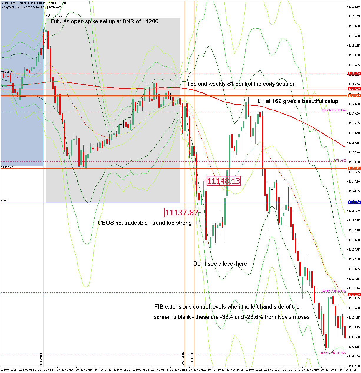 This looked like a tricky market to trade as levels were not respected, implying continuing downward trend and then we saw a sudden reversal. I nice trade this morning, which is not in my plan, would have been to sell the brief move up to the 11200 BNR just after the futures open.