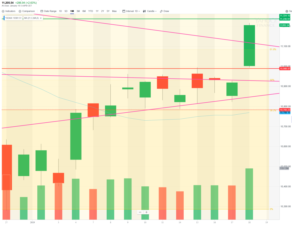 Last week saw lots of corrective backwards and forwards action until Friday when the market exploded upwards and filled a few of December’s gaps. Today we should see a retrace of some of that move and then a contination up to fill the next gaps at 11334. With so much momentum, it seems unlikey that the market will stage a significant reversal today. Buying at the 74.6% or 61.8% retraces of Friday’s move could work, depending on the PA going into it. A move above Friday’s highs at 11216 will be interesting – will buyers then step in and push it into the waiting unfilled gaps above?