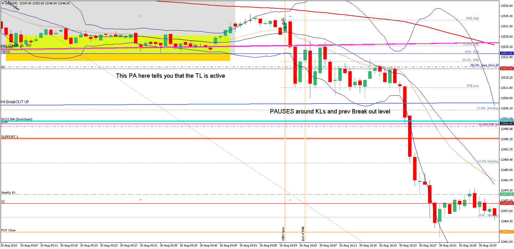 30 August 2018I really wanted to trade this TL but after the first break you can see that it isn’t active. This area is active but not this specific line. It breaks, reverses, breaks to fill the gap and reverses again. This not trending PA and trading this TL would have resulted in seven losses. This presents a dilemma: the TL is cative on higher TFs and I don’t want to miss the break but if I trade this with my 10pt stops I will get whipsawed. The answer is to trade this on a higher TF using a PA stop loss such as a resistance zone or a TL – then if the pattern is valid I will still get the trade albeit at smaller size..