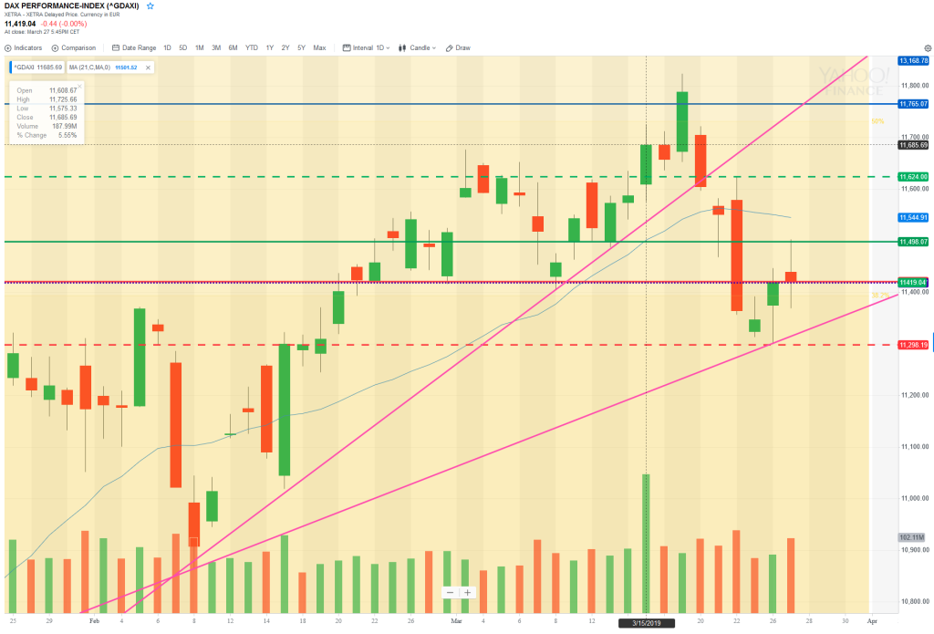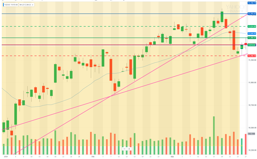 29 Mar – Tests the supporting TL then breaks above 11500 to daily 21MA