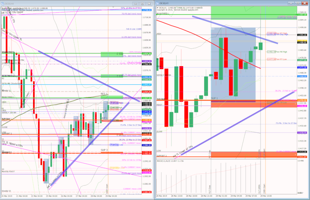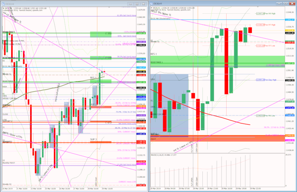 Yesterday the market closed at the lows but this morning the futures have opened near the highs. The TL supporting the move saw two touches yesterday and in both cases, this triggered strong buying. The weekly 200 MA at 11466 was a magnet yesterday, and the market had enough momentum to get beyond it to make a high at 11494, just below the BNR. Today the BNR will be an interesting area and if it fails there, we could see the supporting TL broken as this is now above the weekly 200 MA. Beyond 11500, there are plenty of levels to target – weekly S1 at 11524 and daily 21 MA at 11542. If it breaks 11500, I can watch the response to these levels to see if it is an impulsive or stair step trending move – if it’s the latter there will be plenty of reversals and retests and if it’s the former it will just blast through all levels.