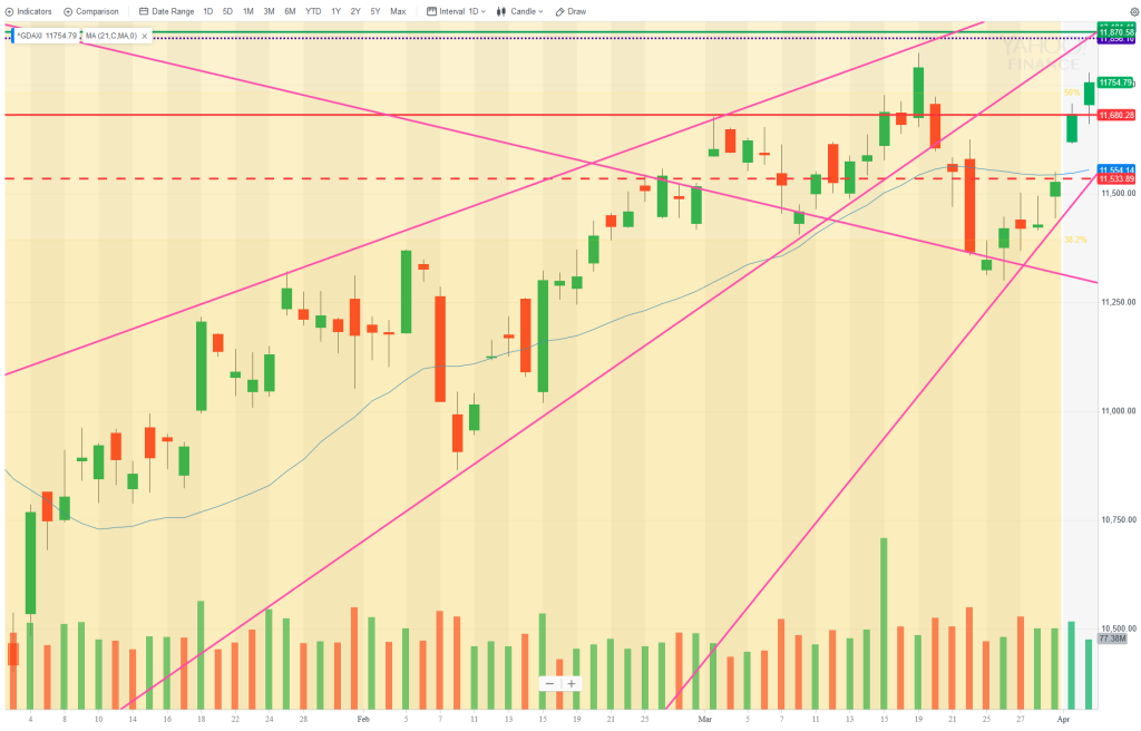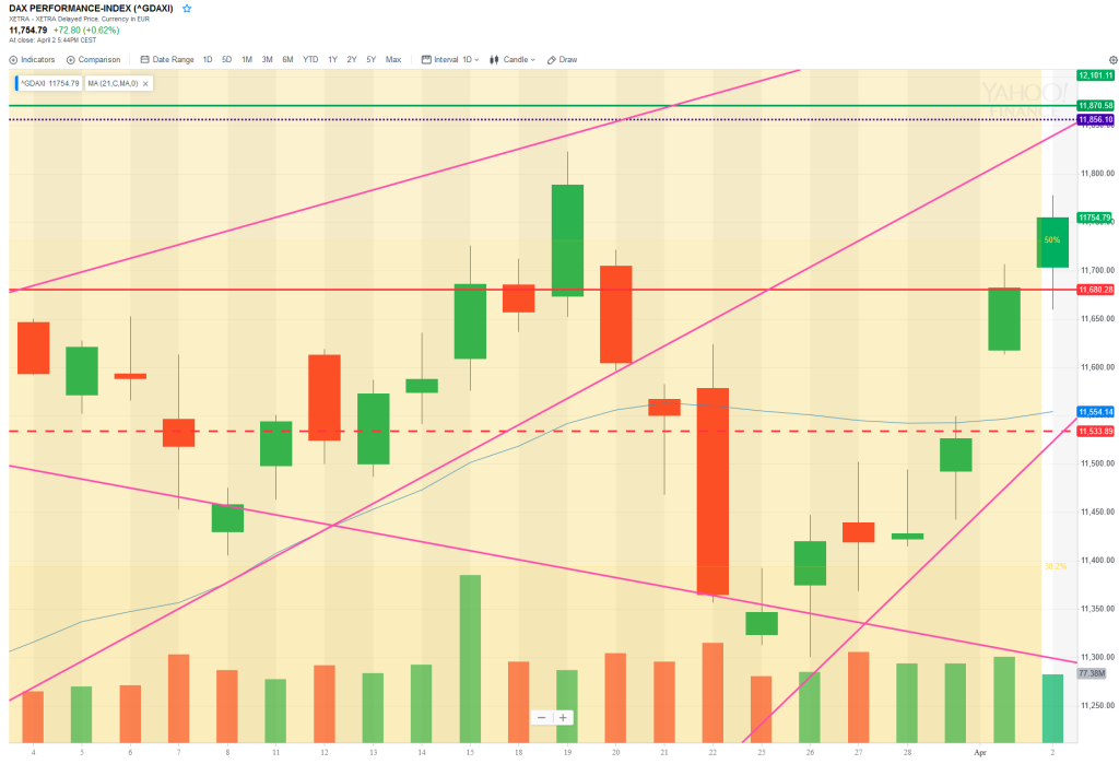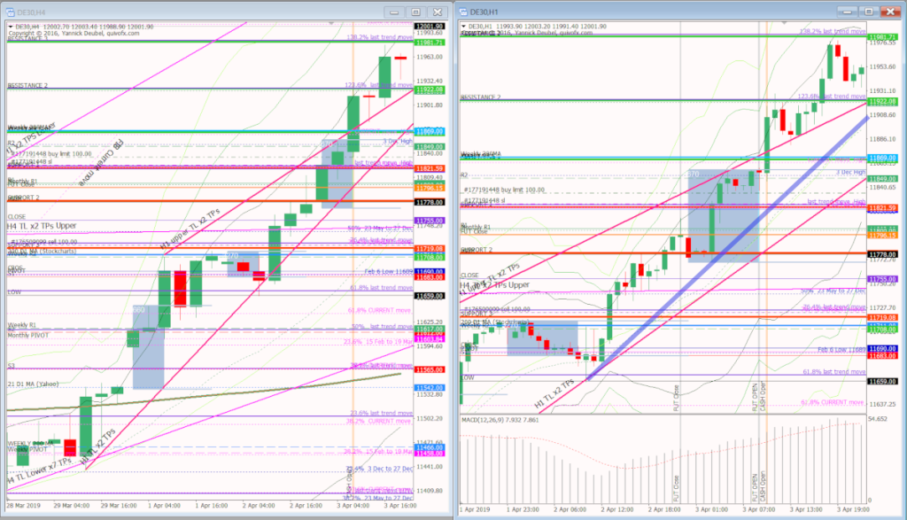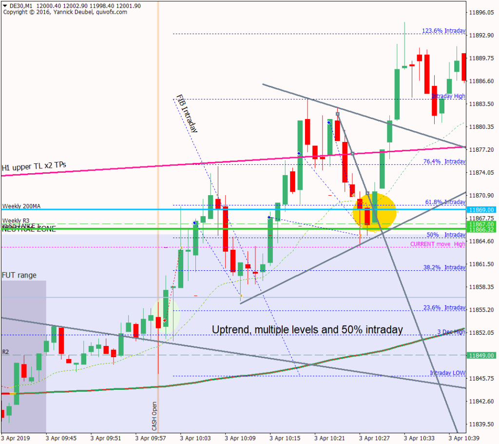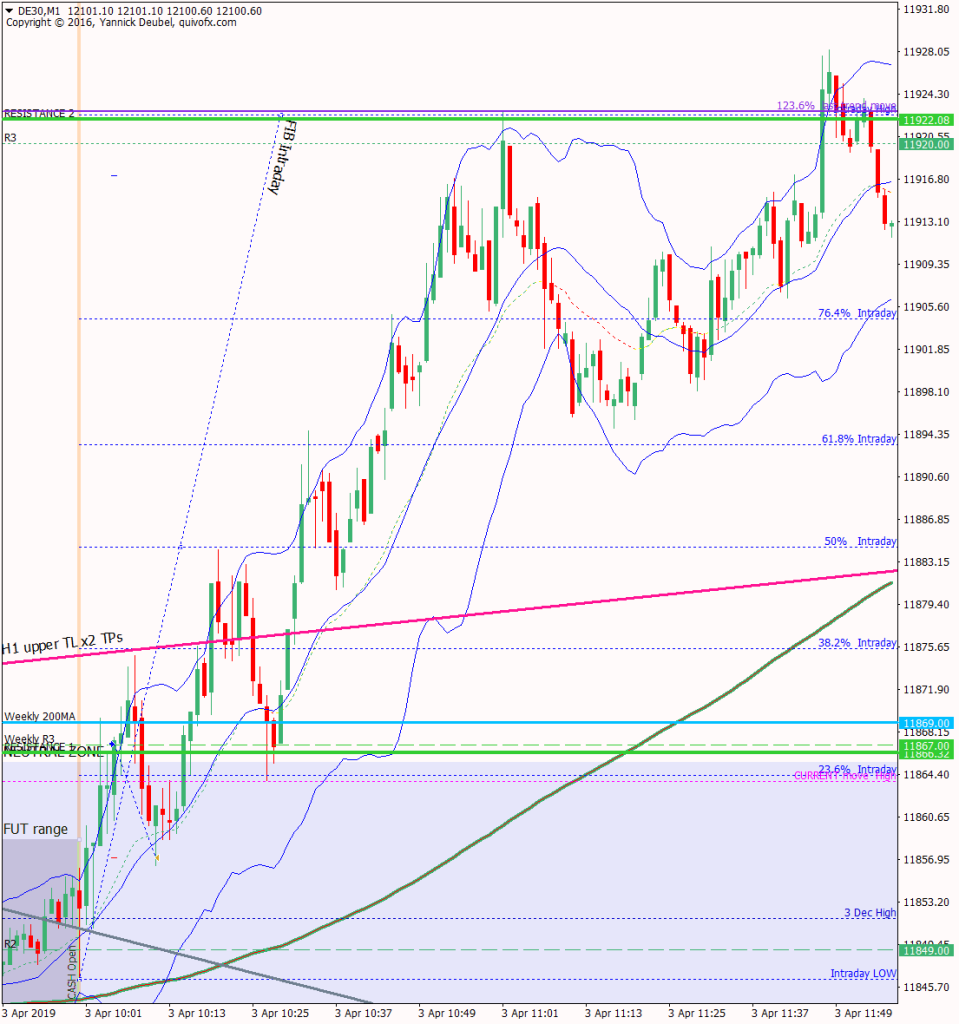 The last few days have been hugely bullish and the market is now more than 200pts above Monday’s open. The market is forming a rising wedge on the H1 chart and is at critical levels, including weekly R3 and daily R2. So will there be a pullback today? The Dax can easily go 1000pts with barely a pause, and the the current trend started at 11300. The market has cleared a lot of critical cash levels: daily 200MA, daily 50MA, weekly 50MA and now it trading around the weekly 200MA at 11869 so that will be the level to trdae today.
