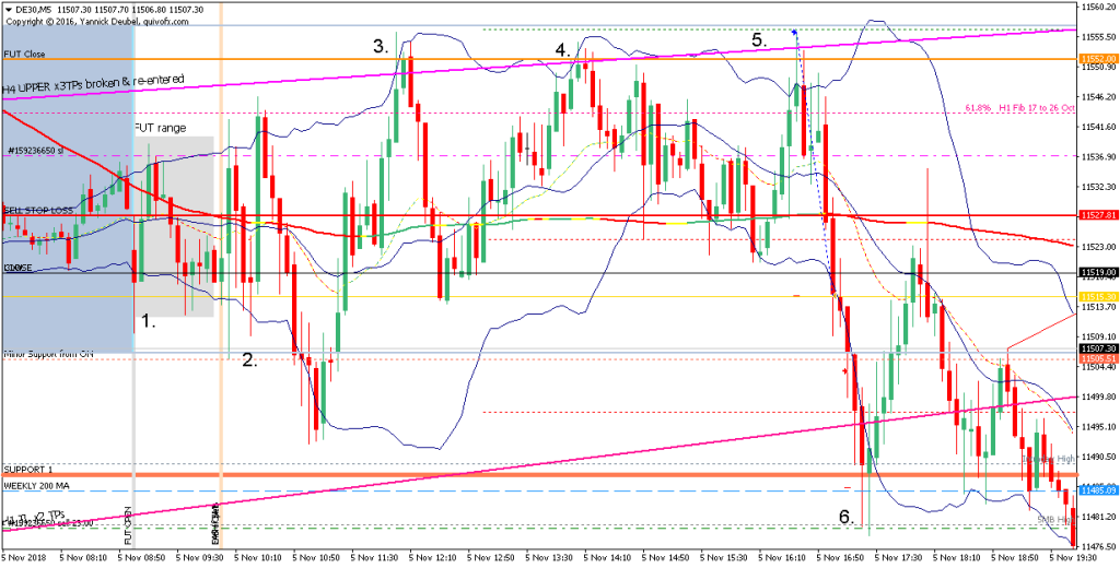 - Just after the open, the market dipped down to the minor support I identified (ON low)and then immediately reversed towards the upper TL. This set the picture for the rest of the day: new highs sold and new lows bought, but with a bullish tone as each reversal from the highs saw a higher low.