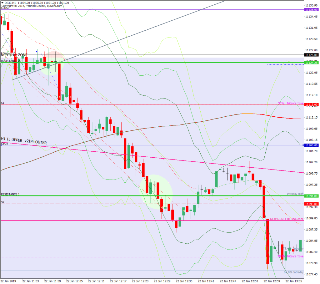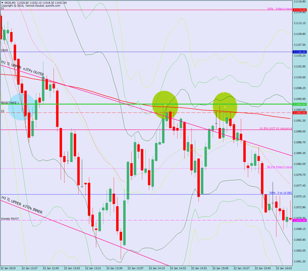 On the first example at RES 2, the 3Min Bolli fails but this gives atext book short setup instead; at RES 2 there is a reaction but its too small to trade – although the fib below sees a tradeable reaction – but overall, the failure of KLs to stop the market indicated that there was more downside to come.RES 1 was the correctlevel though, as it turned out to be the perfect level to fade once the market had definitively turned down.