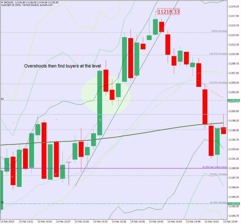 R3 does see a small reversal but the level overshoots before the sellers are seen. My order at the exact level is stopped in minutes. The reaction is only around 10pts so even the best entry would not have worked. Higher probability S3/R3 trades are those that setup later in the session and where the market has travelled some distance from the open.