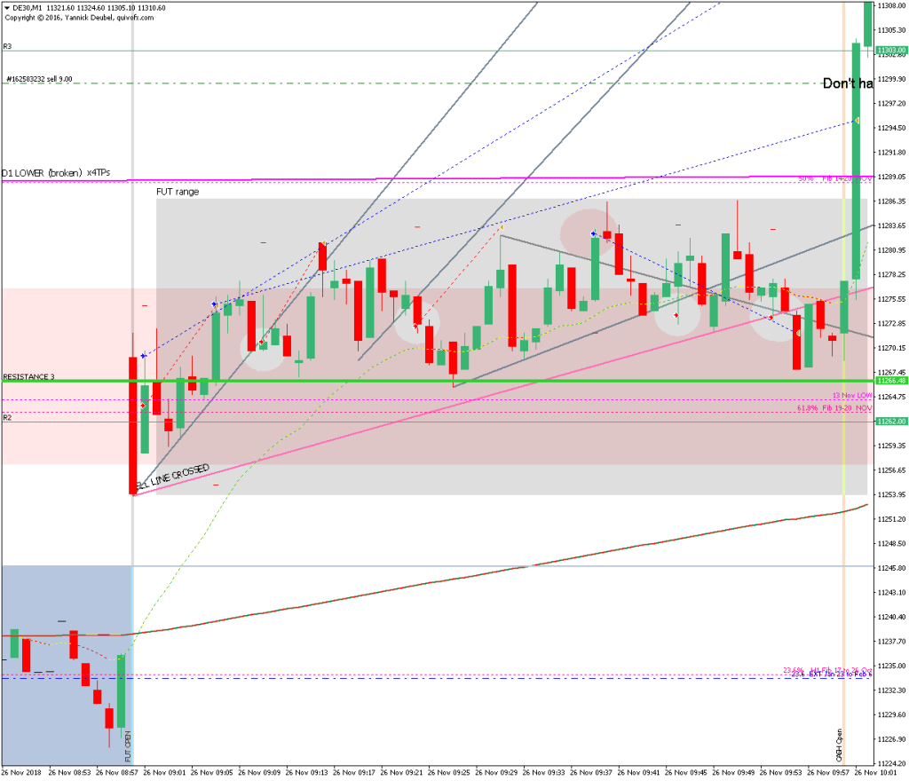 This is a great example of (1) trading against acceptance and (2) using the wrong strategy. On Mon 26th Nov, the market had moved through all my RES levels and at the futures open it got above R2 and stayed there. The futures range was only 30pts but the point was – no one was selling the market – there weren’t new buyers either but price had accepted up here, it was happy there.