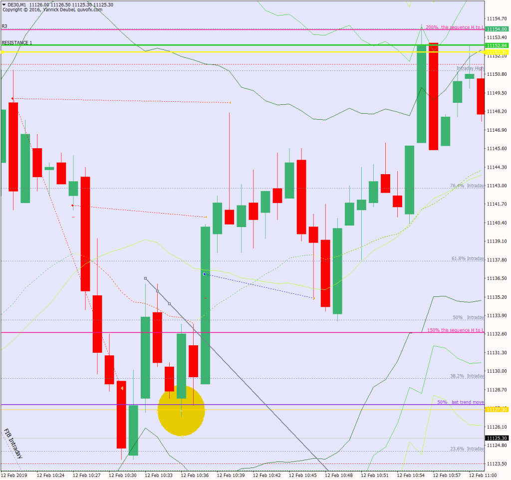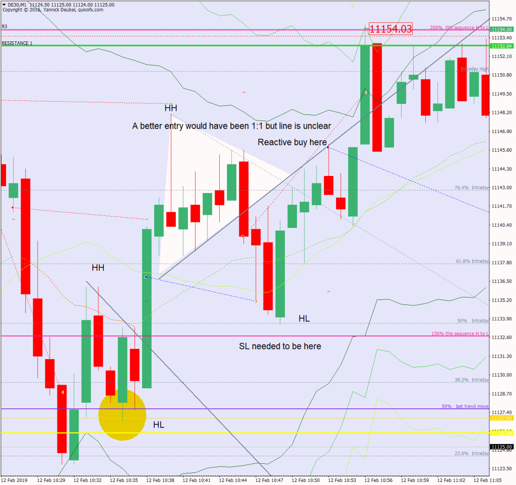Here I wanted to take a break of the TL but it was so fast that my entry was 4pts above where I wanted it to be – and this meant I got stopped when it retraced to the fib. The idea entry in this case would be to use the HL forming at the purple – by making the assumption that the buy off 11123 followed by support at the purple fib would be enough to assume a next leg up was higb enough probability to trade.This is the same PA and the yellow line shows where the stop needs to be on the long when it’s opened – and then after +10 and STE it will still be below KLs. It’s still only a +20 but today’s entire range was 50pts.This was a tricky trade as the lines are not clear. In this case, using STE at 1:1 saves me a loss if my entry is good. This is a broken triangle reversal pattern and if I had traded it using that pattern, I would have seen 1:1 and BE instead of -1R (even better is to trade the upper triangle TL as a retest rather than a straight break). My entry was reactive as that bar would have looked like a big green bar at the time I opened the trade.
