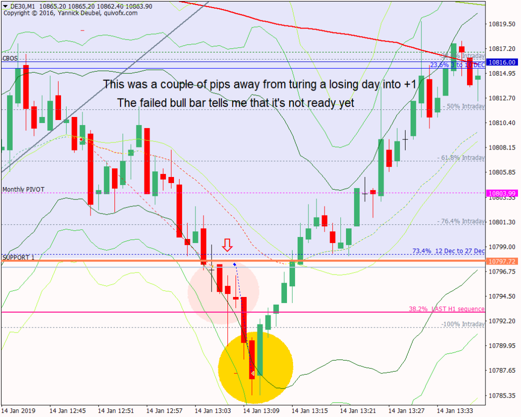 I use pin bars to tell me where price isn’t going. A failed bullish pin bar is a great short entry signal – not by itself but in co-operation with one of my setups, especially triangles.