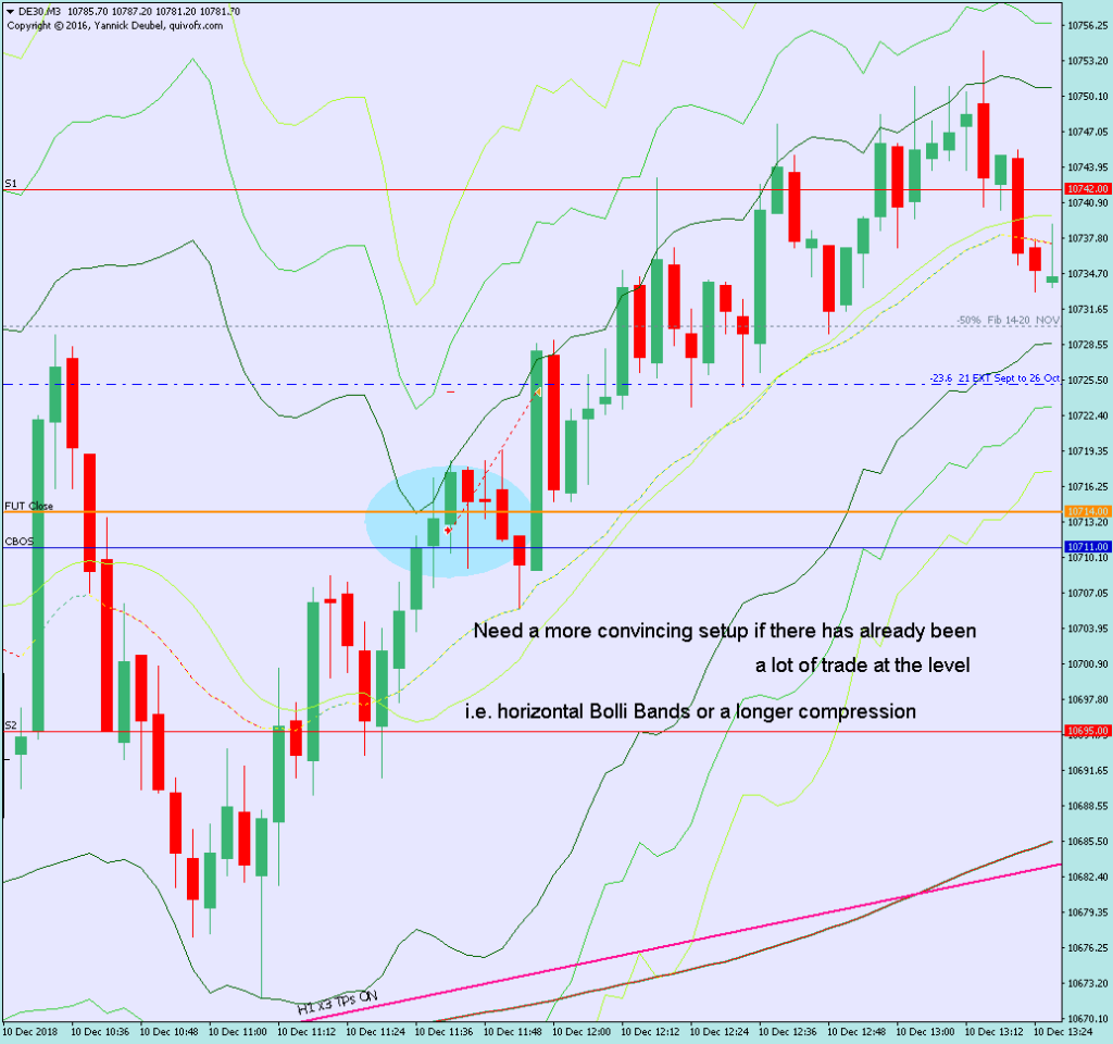 There is a world of difference between a trade at a level that has already been hit and bands that are opening up (indicating a new trend) and fast move into a KL for the first time that session – and if the BBs are horizontal then so much the better.