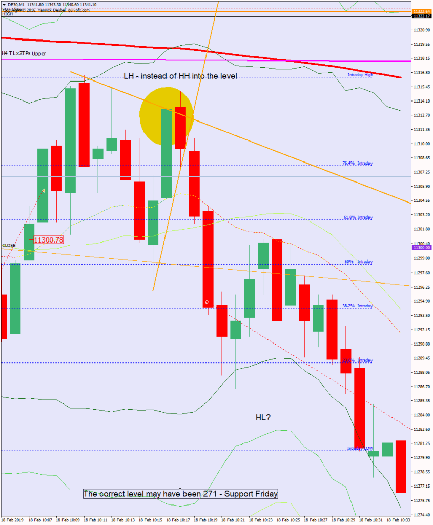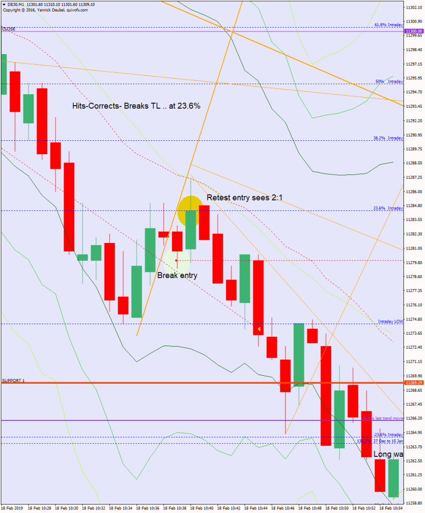 The second example is on the short side and shows the importance of waiting for the retest of the corrective TL to enter. Again, this is clearly with the ST trend and the trade is given greater probability of success because the entry is also a retest of 23.6% intraday fib.